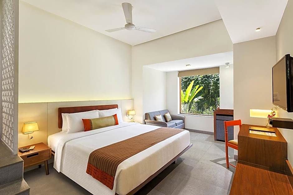 This suite offers the highest level of style and comfort at the resort, with an aesthetically decorated expansive bedroom, a well-appointed living room and an independent balcony. It is further complemented by a spacious private bathroom with a Jacuzzi, and a private terrace with views of the resort and the Baga river.